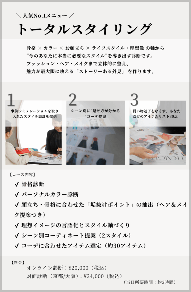 はい!まずは自分の「似合う軸」を知るだけでも「朝の迷いがなくなった」というお声を多くいただいています。さらに「活かし方」まで知りたい方には提案プランもご用意しています。
